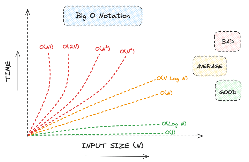 The most commonly used notation for expressing time complexity is Big O notation. Big O gives an upper bound on the growth rate of an algorithm's runtime, helping us focus on the worst-case scenario. Here are some common Big O complexities, from best to worst: